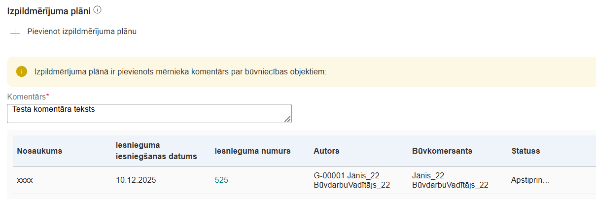 - Ja iesniegumam ir pievienota saite uz izpildmērījuma plāna dokumentiem un kādā no pievienotajiem dokumentiem kādam no būvniecības objektiem ir mērnieka piezīmes, lietotājs redz brīdinājumu: "Izpildmērījuma plānā ir pievienots mērnieka komentārs par būvniecības objektiem” ar visu būvniecības objektu sarakstu. Zem brīdinājuma lietotājs var pievienot komentāru (obligāts teksta lauks), kurā norāda paskaidrojumu