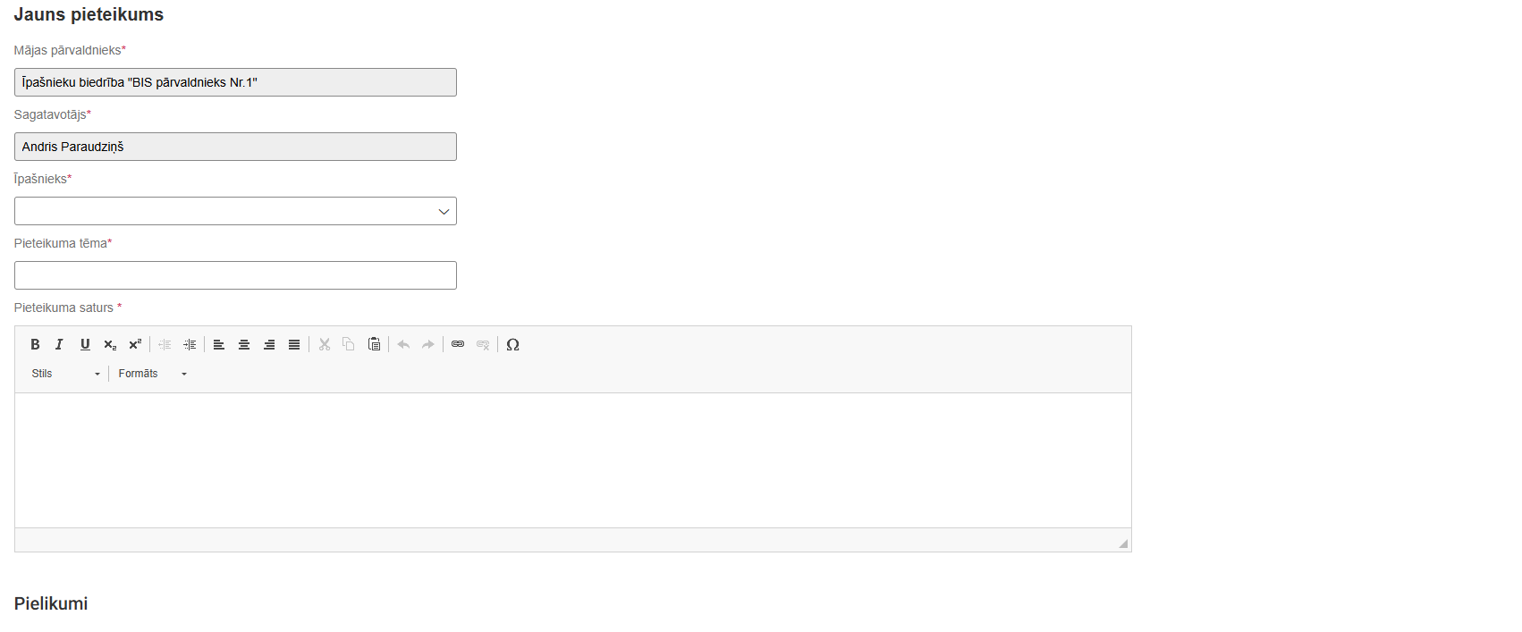 - Māju pārvaldnieks - pārvaldnieks, kuram ir adresēts pieteikums. Aizpildās automātiski kā izveidošanas brīdī spēkā esošais pārvaldnieks;