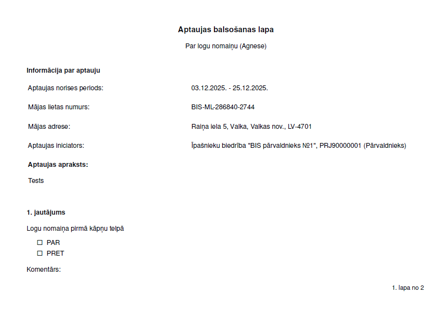 Autorizēts BISP lietotājs atver Māju lietu un tās sadaļā "Aptaujas" izvēlas nepieciešamo aptauju. Ja aptaujas statuss ir "Gatava uzsākšanai", "Paziņošanā", "Paziņots" vai "Aktīvs", lietotājs var izveidot balsošanas lapas izdruku, izvēloties aptaujas detalizētā skata lapā darbību <Izdruka>: