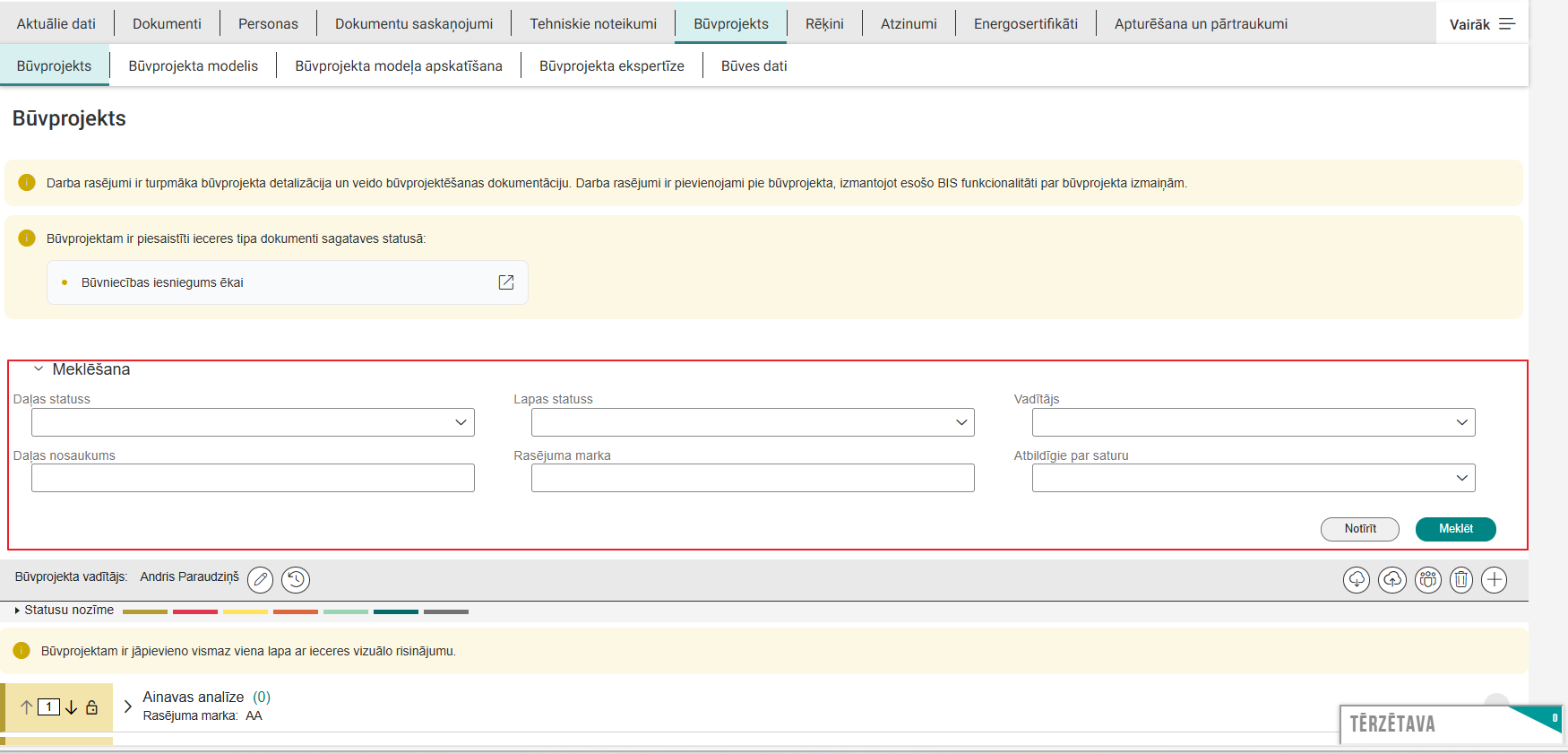 Meklēšanas bloks sadaļā "Būvprojekts"