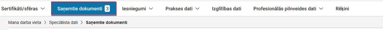 Atverot Būvspeciālista / Neatkarīga eksperta darba vietu, no galvenās izvēlnes jāizvēlas sadaļa Saņemtie dokumenti (lietotājam informatīvi tiek parādīts saņemto dokumentu skaits aiz izvēlnes nosaukuma):