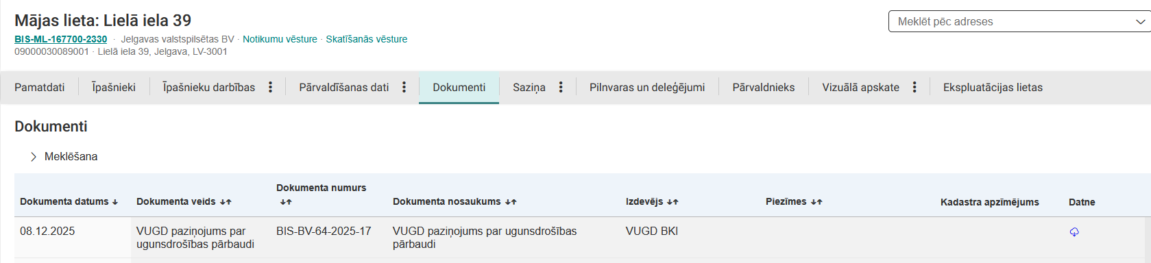 - Ja lietotājs ir fiziska persona un reģistrēts māju pārvaldnieku reģistrā, kā aktīvs pārvaldnieks, un īpašumā esoša būve ir reģistrēta šī pārvaldnieka pārvaldībā.