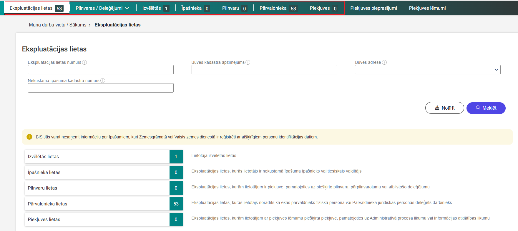 • Pārvaldnieku lietas - Ekspluatācijas lietas, kurās lietotājs norādīts kā dzīvojamās mājas pārvaldnieks FP vai Pārvaldnieka JP deleģēts darbinieks;