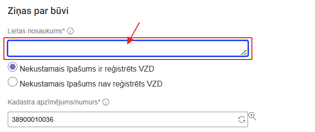 Lietotājam dokumenta solī “Ziņas par būvi” ir pieejams obligāti aizpildāms lauks “Lietas nosaukums”: