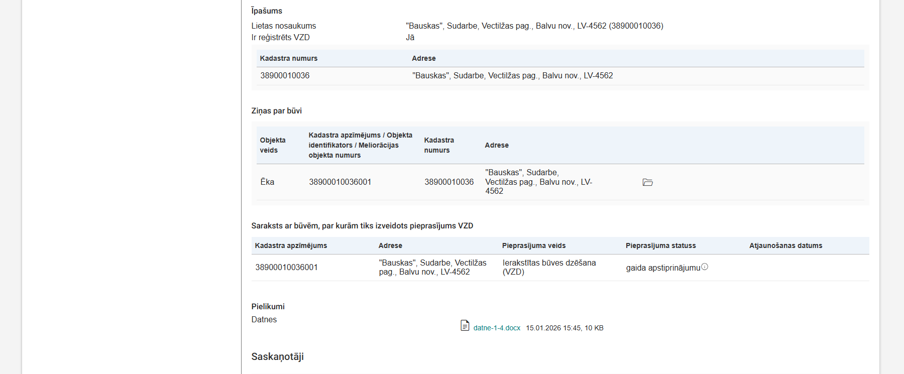 Saraksts “Saraksts ar būvēm, par kurām tiks izveidots VVDZ pieprasījums”. Pirms saraksta lietotājam atrāda informatīvu paziņojums "Iesniedzot šo dokumentu, pēc tā apstiprināšanas automātiski tiks izveidoti datu apstrādes pieprasījumi VVDZ par zemāk norādītām būvēm.". Būves sarakstā grupē pēc īpašuma numura. Sarakstā atrāda: