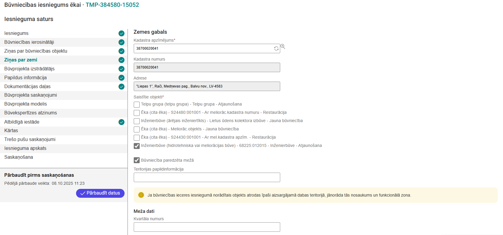 Lietotājam labojot sadaļas "Ziņas par būvniecības objektu" vai "Ziņas par zemi" norādīto informāciju, tiek atkārtoti veikta pārbaude par piederību kultūras pieminekļu, pieminekļu teritorijas un aizsardzības zonu sarakstam un attiecīgo pazīmju uzstādīšana.