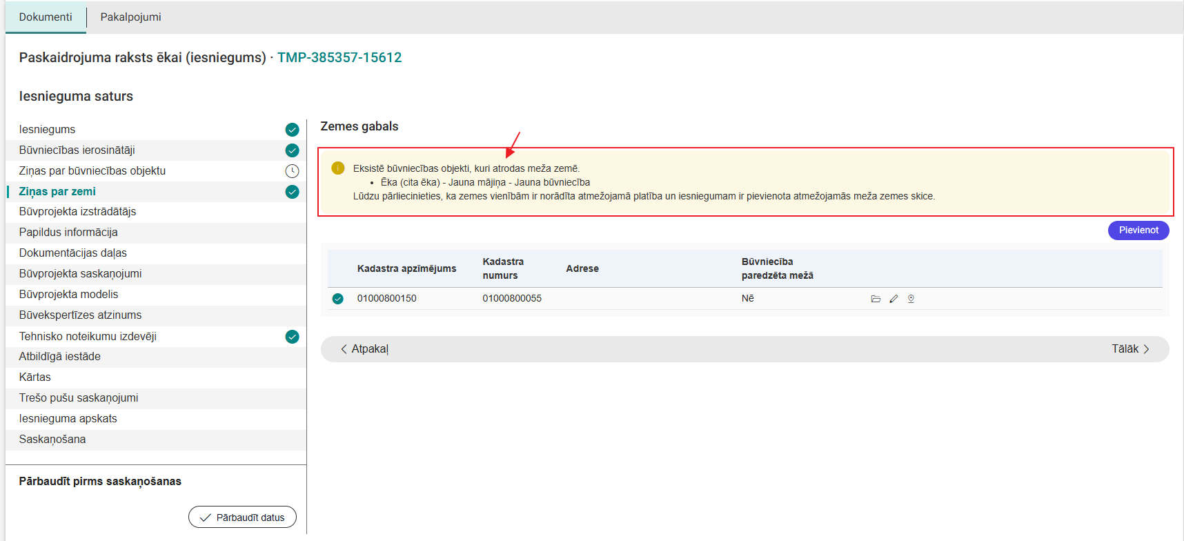 Obligāti jānorāda vismaz viens saistītais objekts sadaļā "Saistītie objekti". Ja objekts netiek norādīts, tiek attēlots paziņojums "Katrai zemes vienībai ir jābūt saistītai ar vismaz vienu objektu". Saistīto objektu saraksts tiek pielasīts no ievadītajiem datiem sadaļā "Ziņas par būvniecības objektu".