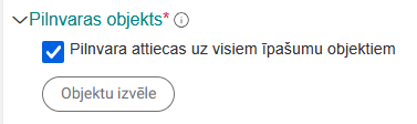 - Pilnvaras objekts - iespēja izvēlēties un norādīt vienu īpašuma objektus par kuru tiek veidota pilnvara. Objektu var norādīt tikai no saraksta, jo piedāvāto objektu saraksts ir atkarīgs no pilnvaras veida un no lietotāja profila. (Skatīt tālāk aprakstu.);