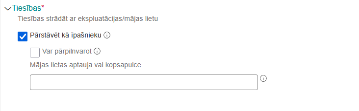 - Tiesības - “Pārstāvēt kā īpašnieku” vai ierobežot tikai "Pārstāvēt kā īpašnieku aptaujā vai kopsapulcē”, izvēloties vienu vai vairākus ierakstus no pilnvaras objektam saistītās Māju lietas aptaujām un kopsapulcēm, kuras ir statusā "Paziņots" vai "Aktīvs". Iespējams piešķirt pārpilnvarošanas tiesības.