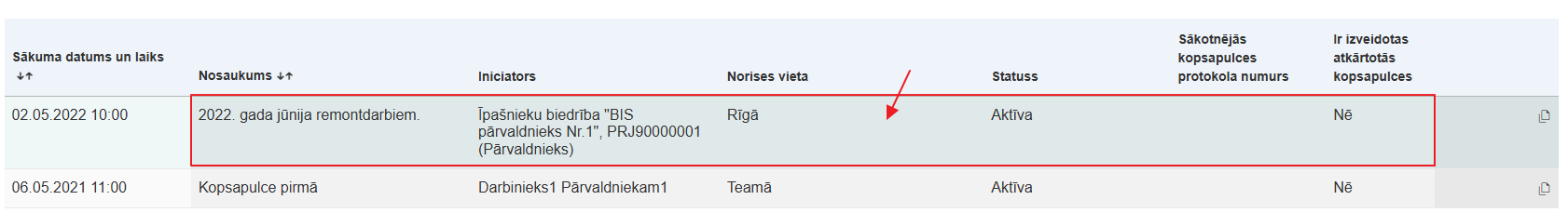 Jau izveidotas kopsapulces detalizētos datus var aplūkot, kopsapulču sarakstā noklikšķinot uz ieraksta rindas: