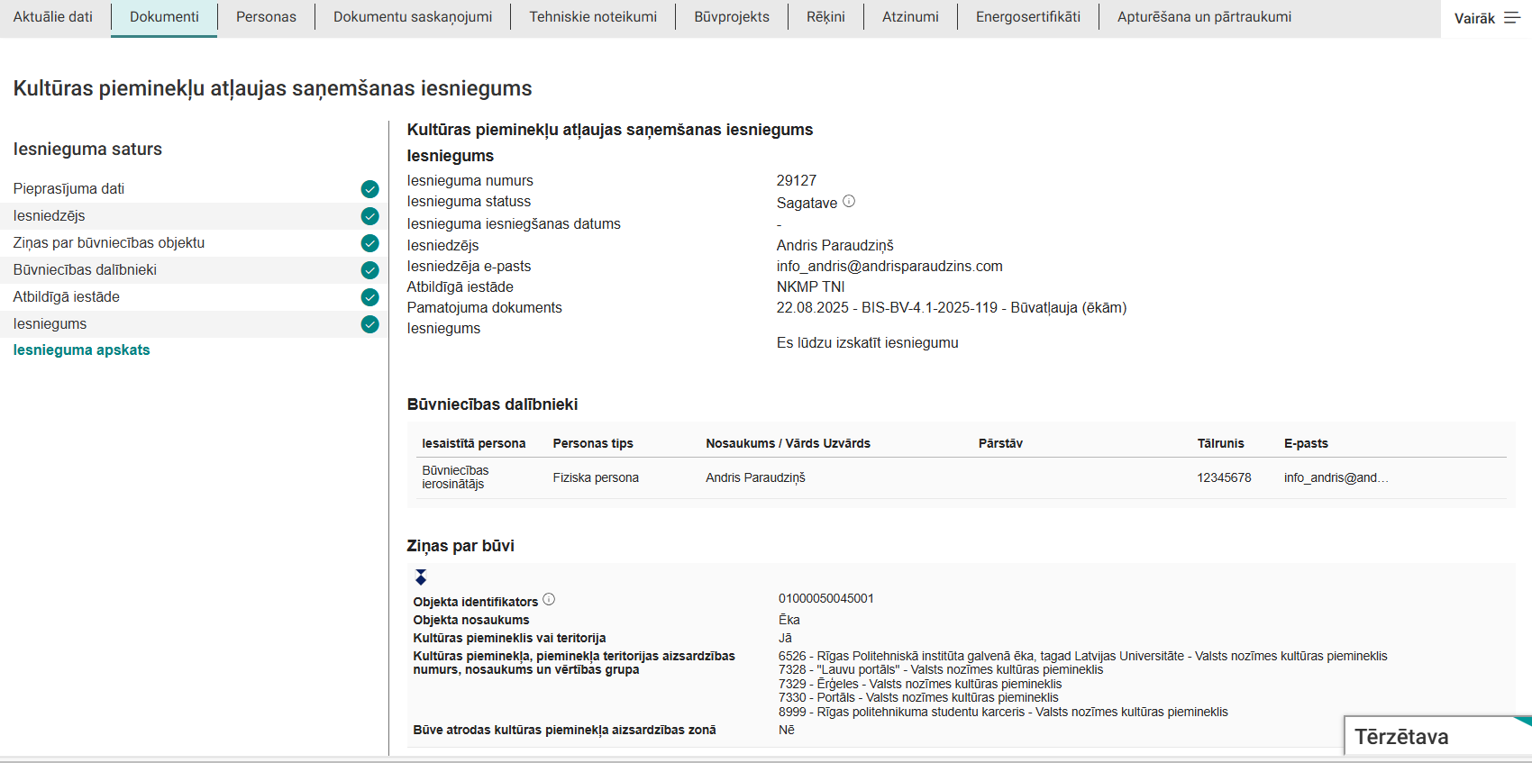 Attēls. Kultūras pieminekļu atļaujas saņemšanas iesniegums – pieprasījuma dati.