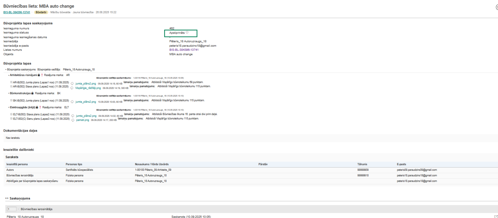 - sistēma atrod neapstiprinātus būvvaldes lapas saskaņojuma pieprasījumus par piesaistītajām lapu versijām un pievieno saiti uz apstiprināto iesniegumu izmaiņu veikšanai būvprojektā: jaunākais apstiprinātais iesniegumu izmaiņu veikšanai būvprojektā no dokumentu sadaļas BISP.