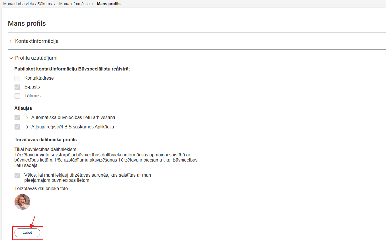 Autorizēts BISP lietotājs savā profilā var iespējot Tērzētavu, nospiežot spiedpogu formas apakšā <Labot>.