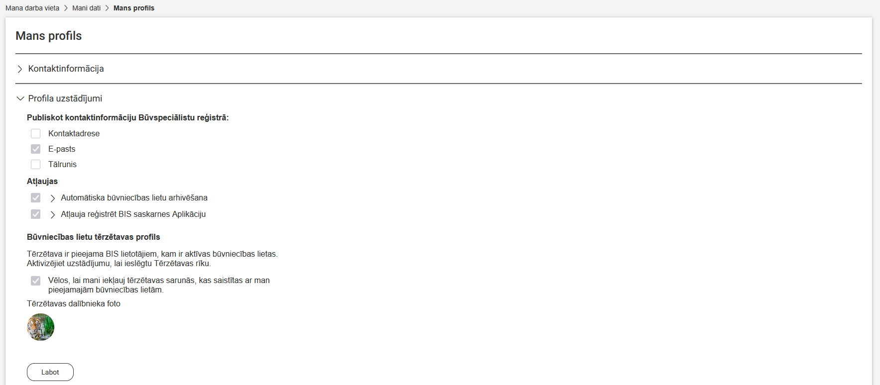 Autorizēts BISP lietotājs savā profilā var iespējot Tērzētavu, nospiežot sadaļā Profila uzstādījumi pogu <Labot>.