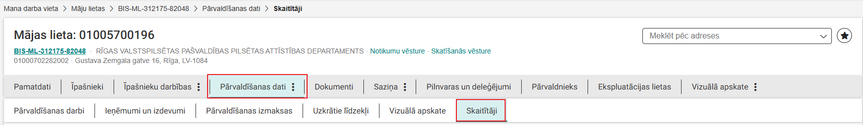 Mājas lietas sadaļa Skaitītāji ir pieejama zem galvenās izvēlnes posma Pārvaldīšanas dati.
