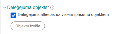 Lietotājs var atzīmēt izvēles rūtiņu "Deleģējums attiecas uz visiem Pārvaldāmajiem objektiem" - pazīme piešķir deleģētajai personai rīcības tiesības visos deleģētāja pārvaldīšanā esošajos objektos - Mājas lietās un Ekspluatācijas lietās, un, mainoties deleģētāja Pārvaldāmo objektu sarakstam, deleģējums nav jāmaina, lai nodrošinātu piekļuvi jaunajiem objektiem