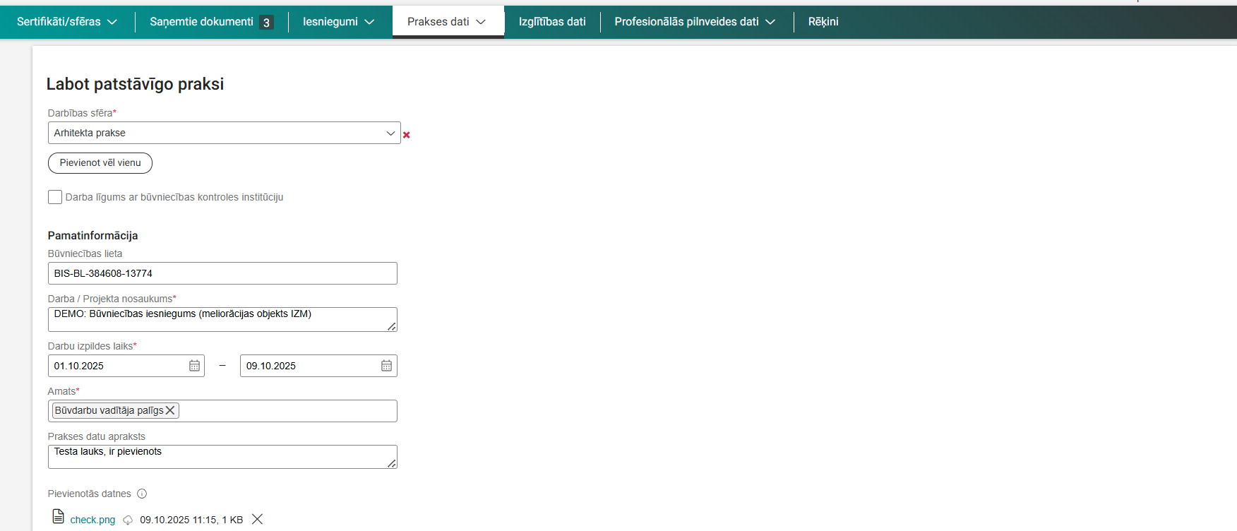 Labojot sistēmas veidotu būvspeciālista prakses ierakstu (jebkurā no tā statusiem), ja ierakstam nav izvēlēts “Darba līgums ar būvniecības kontroles institūciju”, lietotājs redz un var labot prakses datu apraksta lauku: