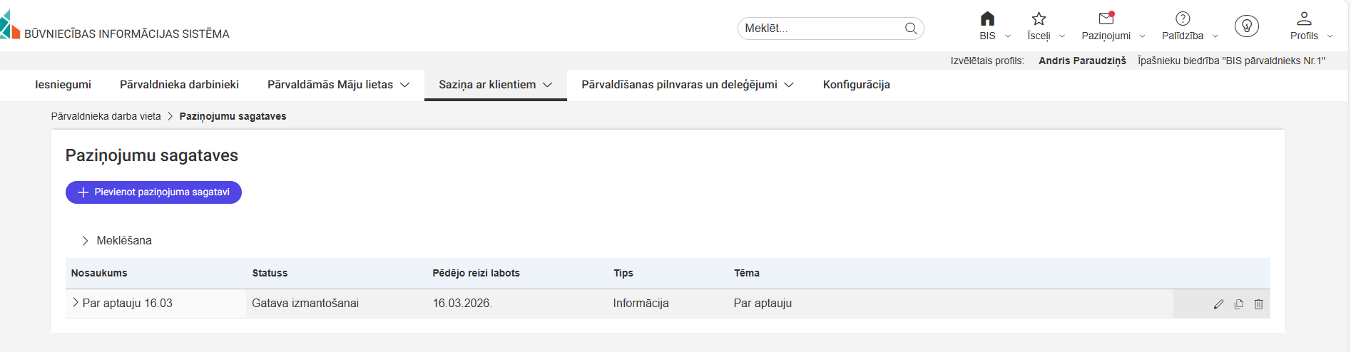 Mājas pārvaldnieks vai tā pārstāvis var izveidot vai mainīt paziņojuma sagataves, lai veidotu paziņojumus ērtākā veidā, izmantojot iepriekš izveidotu sagatavi.