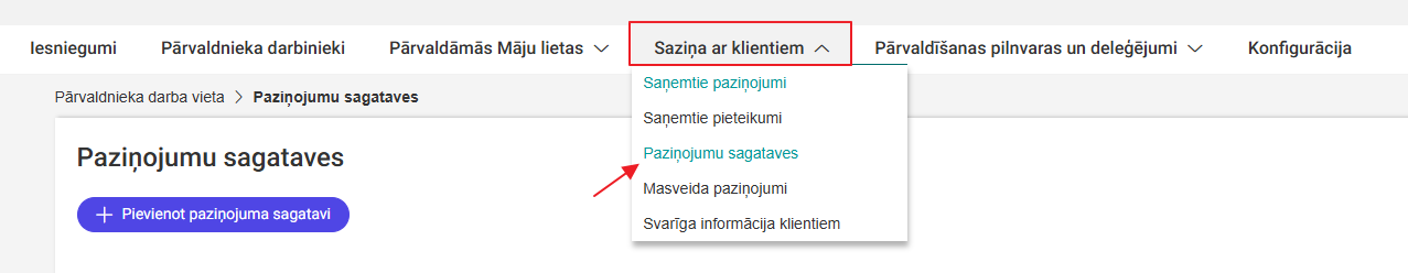 Sadaļa "Paziņojumu sagataves" pieejama, atverot "Pārvaldnieka darba vietu" un galvenajā izvēlnē izvēloties "Saziņa ar klientiem" un apakšsadaļu "Paziņojumu sagataves":