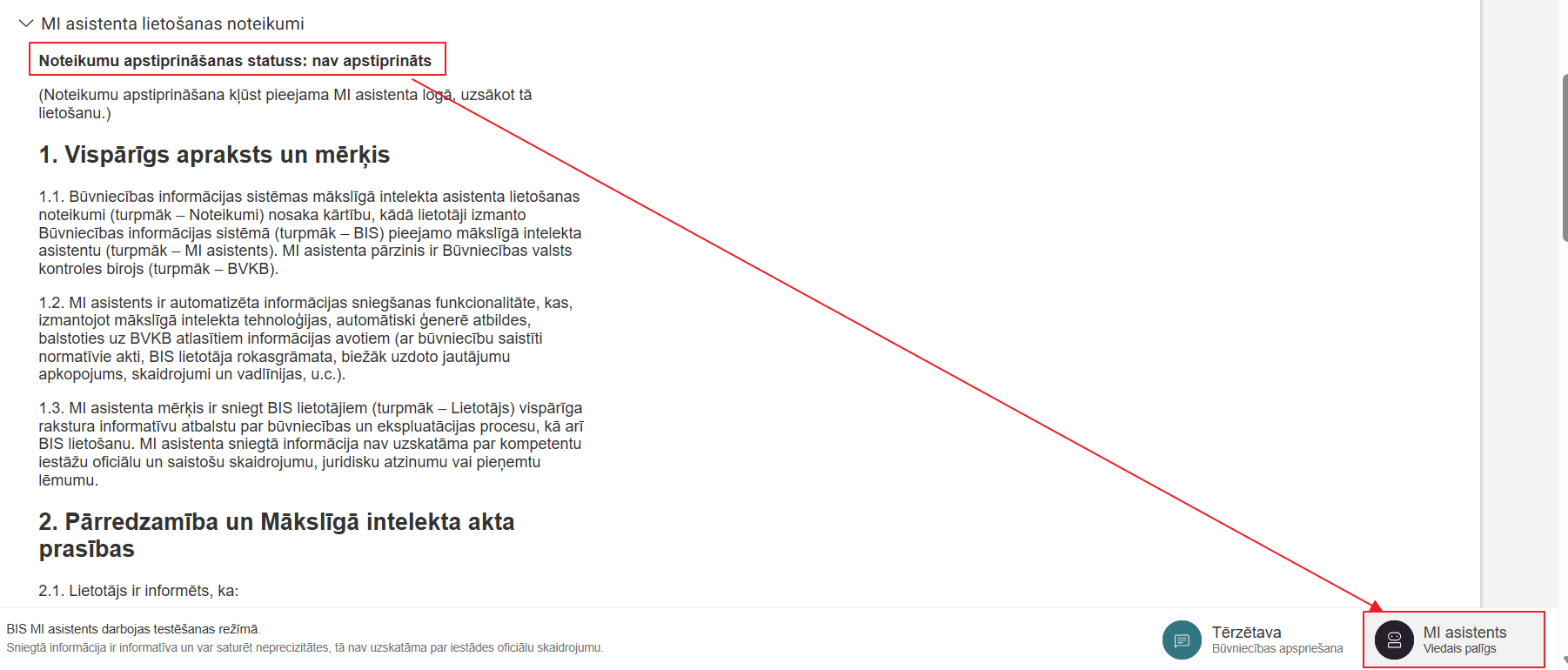 Ja MI asistenta lietošanas noteikumi nav apstiprināti, tad lietotājam šajā sadaļā tiek attēlots informatīvs teksts: "Noteikumu apstiprināšanas statuss: nav apstiprināts. (Noteikumu apstiprināšana kļūst pieejama MI asistenta kogā, uzsākot tā lietošanu.)