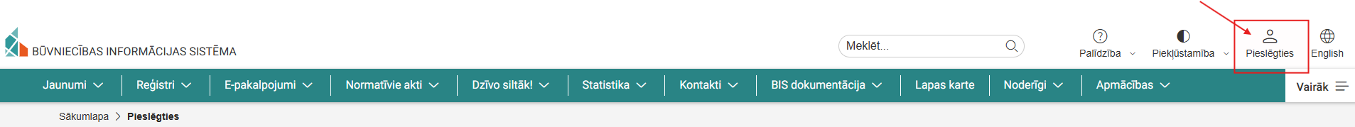 Lai pieslēgtos un autorizētos BISP https://bis.gov.lv vai https://bis.gov.lv/bisp, jāizvēlas opcija <Pieslēgties>, kas atrodas sākumlapas labajā augšēja stūrī.