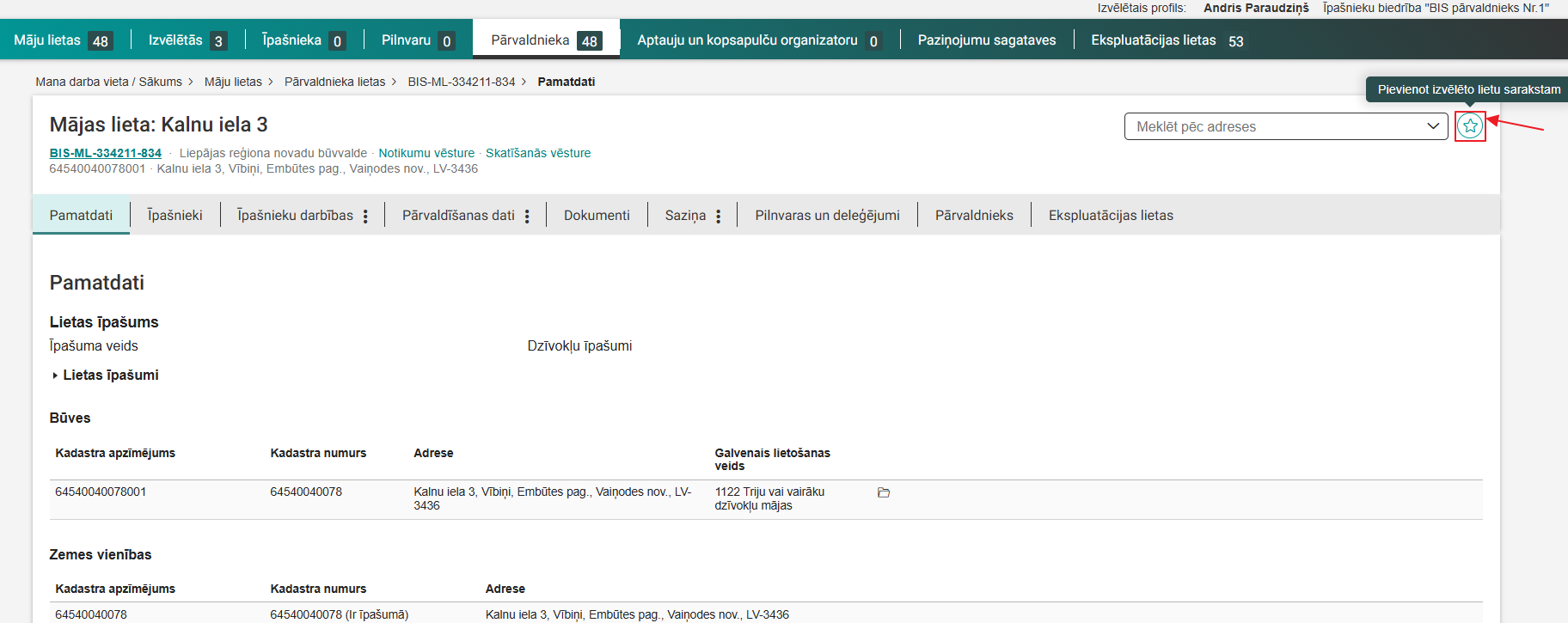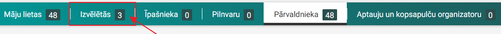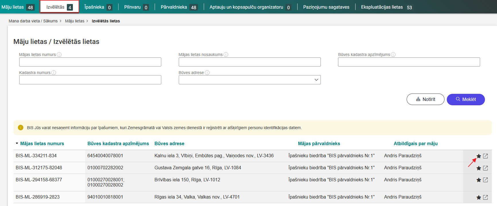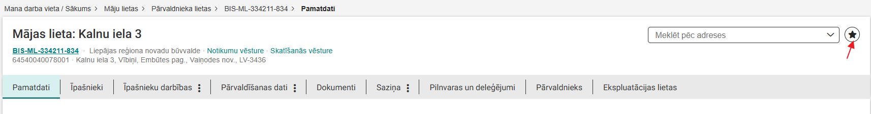 Mājas lietas sadaļā "Pamatdati", mājas lietas galvenē ir ikona ar zvaigznīti "Pievienot izvēlētajām lietām", kuru aktivizējot (iekļikšķinot), lieta tiek pievienota māju lietu saraksta filtram jeb sarakstam "Izvēlētās":