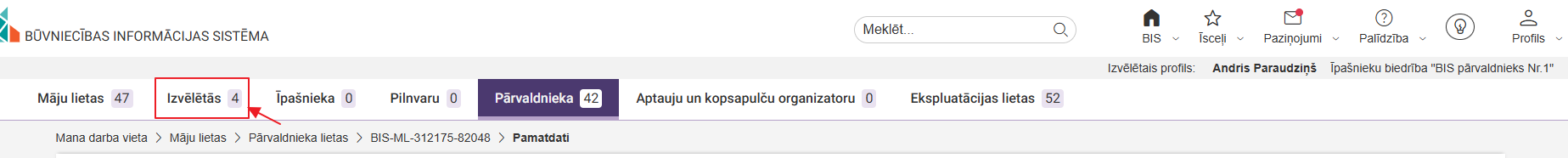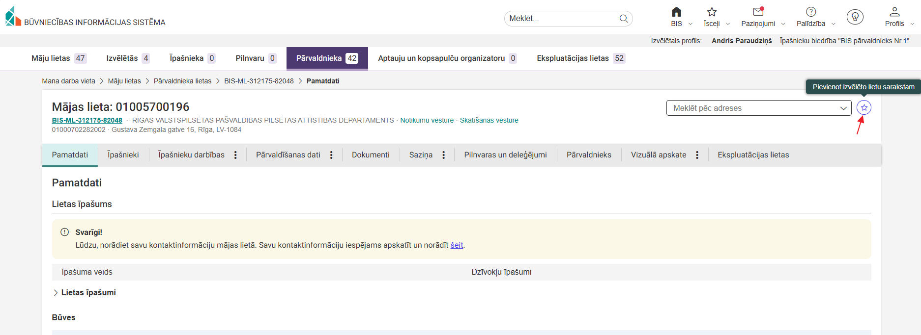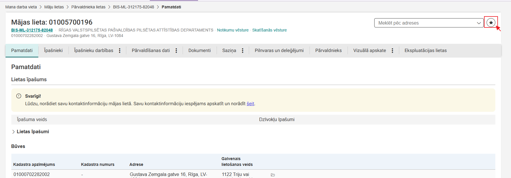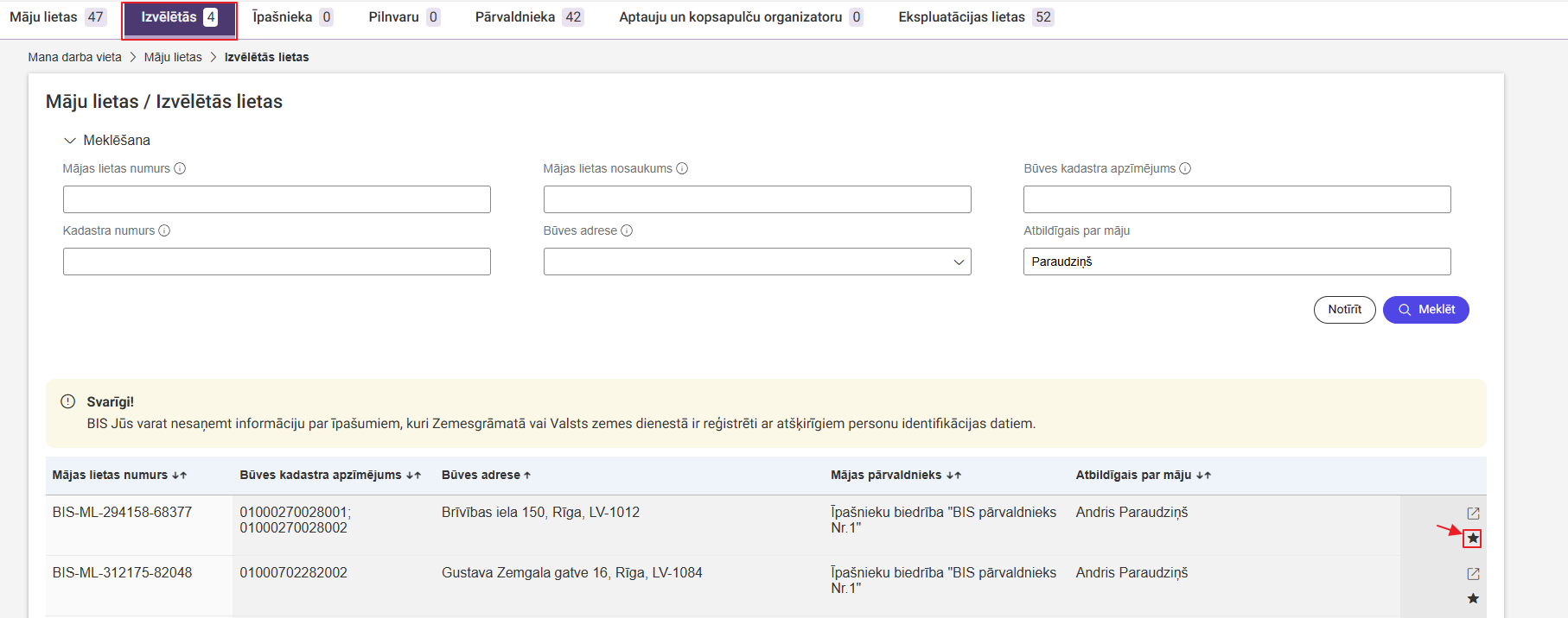 Mājas lietas sadaļā "Pamatdati", mājas lietas galvenē ir ikona ar zvaigznīti "Pievienot izvēlētajām lietām", kuru aktivizējot (ieklikšķinot), lieta tiek pievienota māju lietu saraksta filtram jeb sarakstam "Izvēlētās":