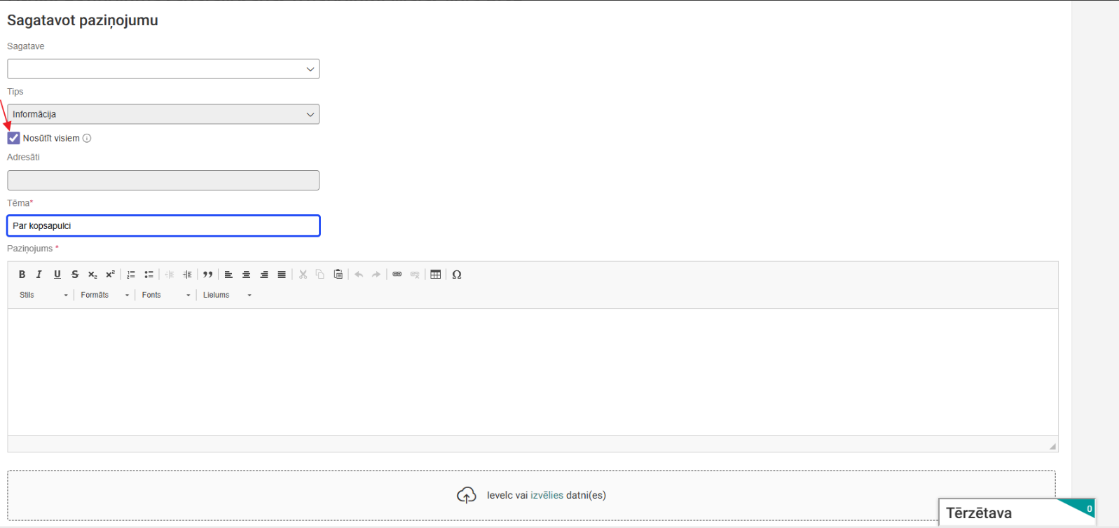 - Tēma - teksta ievades lauks, obligāts; - Paziņojums - formatējama teksta ievades lauks, obligāts. Iespēja tekstā iekļaut arī hipersaites uz citu resursu; - Pievienotie dokumenti - pievienot vienu vai vairākas datnes, kuras nosūtīt caur paziņojumu.