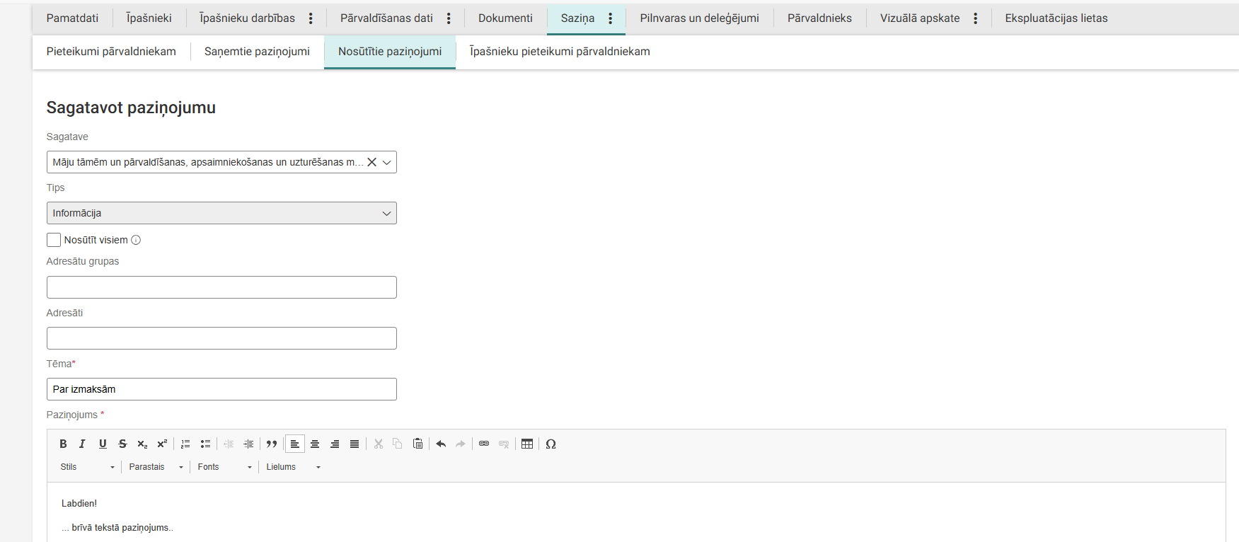 - Par mājas informāciju atbildīgo pārvaldnieka darbinieku (ABI). Lietotājs var atzīmēt paziīmi [v] Nosūtīt visiem. Ieklikšķinot pazīmi "Nosūtīt visiem", lauks "Adresāti" kļūst nerediģējams:
