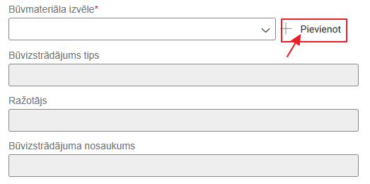Būvmateriāla izvēle – obligāts lauks, kur jānorāda būvizstrādājums/materiāls. Izvēle no šīs būvniecības lietas būvdarbu žurnālā izmantotām būvizstrādājuma/materiāla vērtībām vai, ja būvdarbu žurnāla konfigurācijā nav norādīts, ka materiālu un būvizstrādājumu saraksts papildināms tikai caur konfigurāciju, var norādīt jaunu vērtību, un aizpildīt datu laukus.