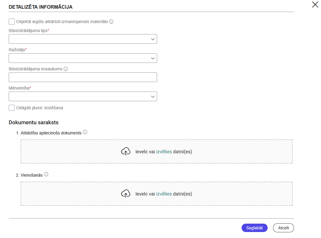- Būvizstrādājuma tips – obligāts lauks, izvēle no vērtību saraksta;