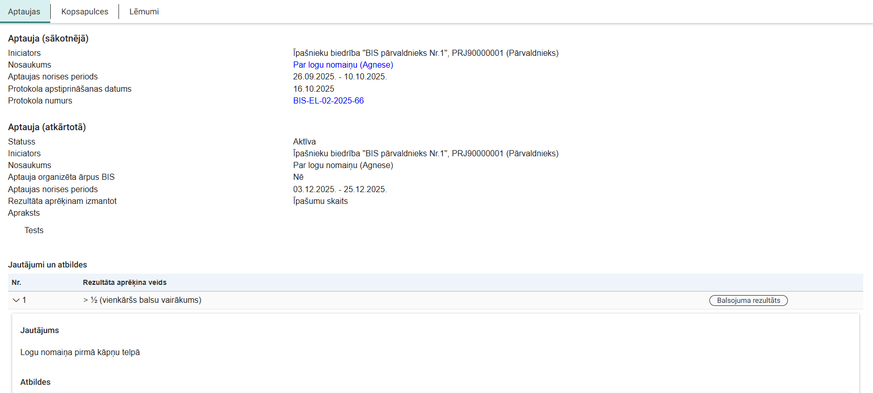 - Aptaujas balsojuma rezultāts – atrāda jautājumu sarakstu, kurā par katru jautājumu atrāda: