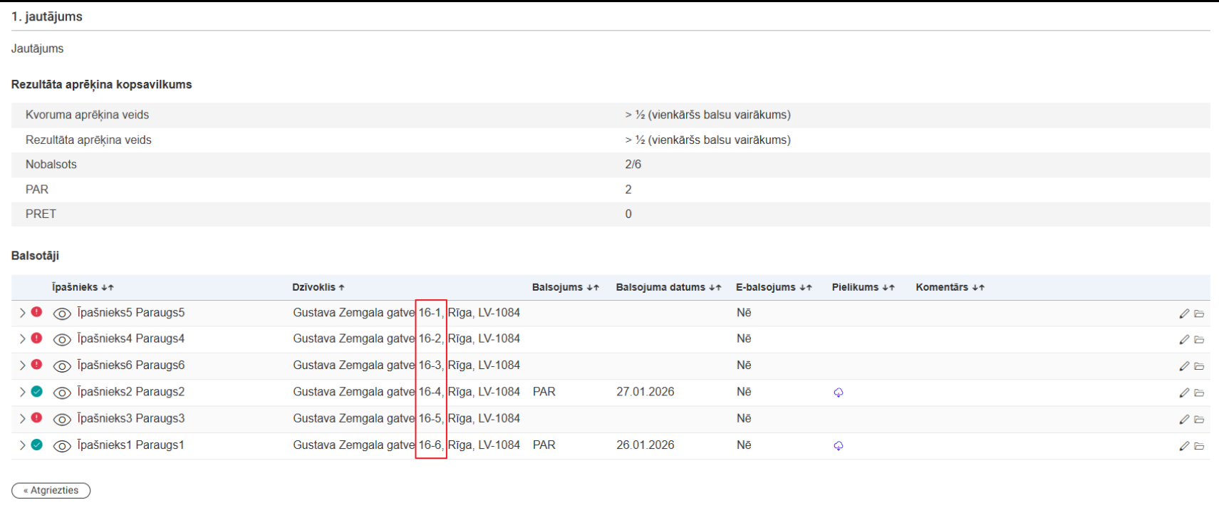 - Ja balsotāju sarakstā ir dzīvokļu īpašumi, par katru balsotāju atrāda: