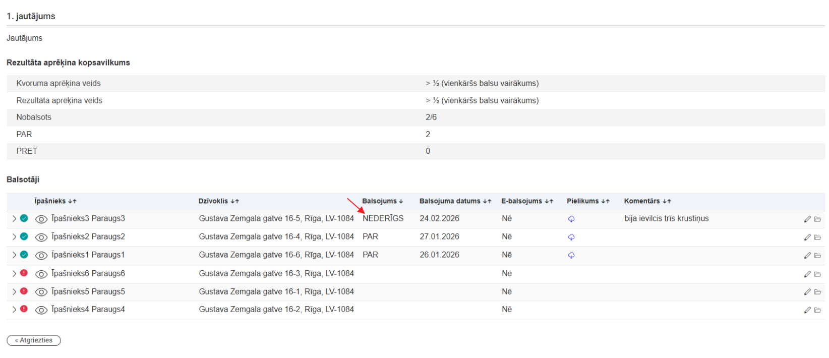 Konkrēta dzīvokļa balsojuma aizpildes formā ir pieejama vērtība "Nederīgs balsojums".