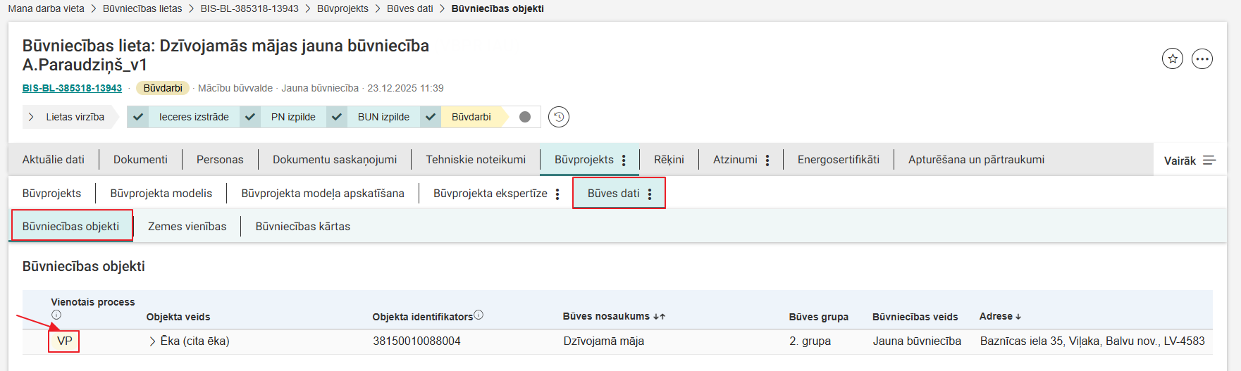 - Vienotā procesa pazīmes atrādīšana būves datos būvprojekta sadaļā.
