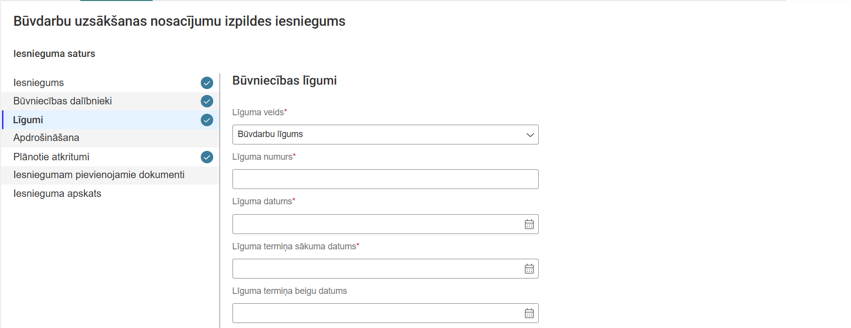 Attēls. "Būvdarbu uzsākšanas nosacījumu izpildes iesnieguma" pirmais ievades solis.