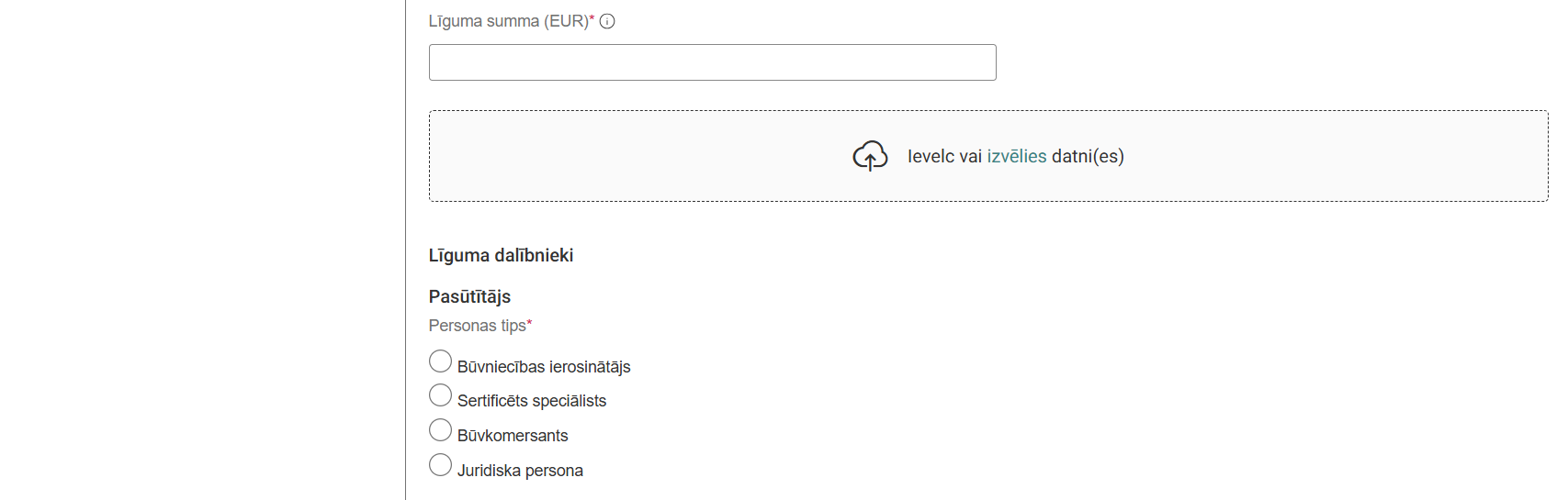 - Līguma veids – obligāts, izvēle no vērtību saraksta: “Būvdarbu līgums”, “Būvuzraudzības līgums”, “Autoruzraudzības līgums”, “Savām vajadzībām (saviem spēkiem)”.
