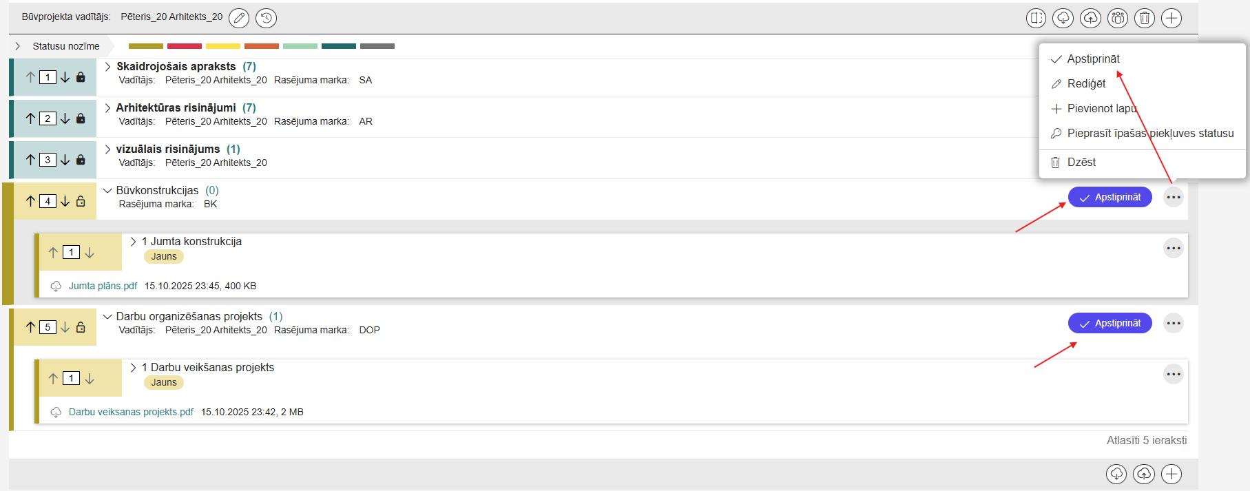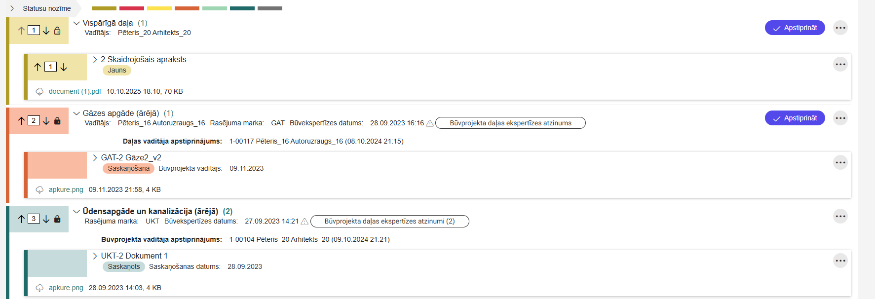 Būvprojekta lapu statusi tagad izcelti, pielietojot atbilstošo krāsu kodējumu.