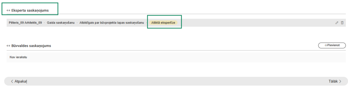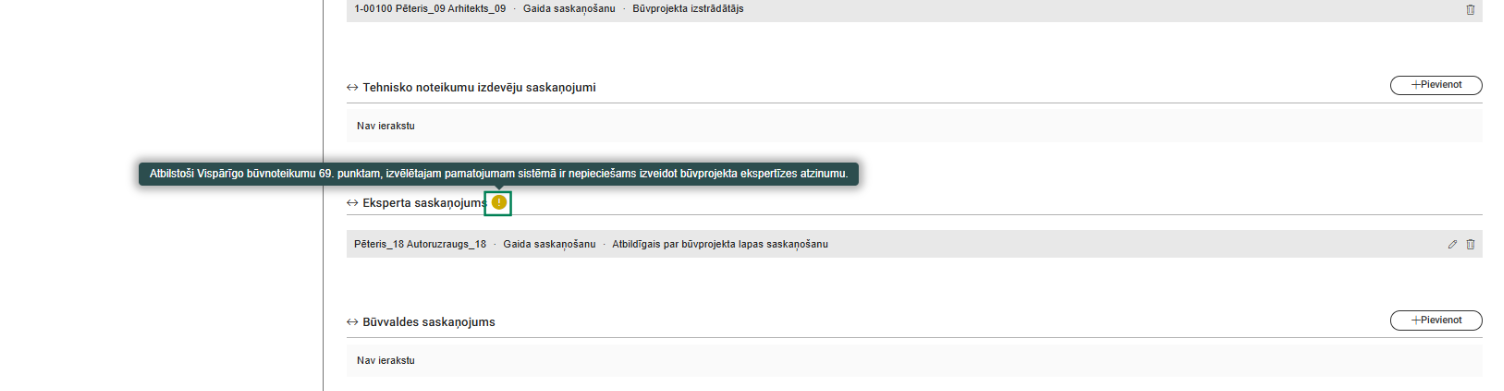 - Ja vismaz vienai lapai, kā izmaiņu pamatojums ir norādīts "Atbilstoši Vispārīgo būvnoteikumu 69.punktam.", sadaļā "Eksperta saskaņojums" būs paziņojums "Ir nepieciešams eksperta atzinums".