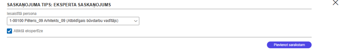 - Lietotājam tiek atrādīts informatīvs paziņojums, ka ‘Atbilstoši Vispārīgo būvnoteikumu 69. punktam, izvēlētajam pamatojumam sistēmā ir nepieciešams izveidot būvprojekta ekspertīzes atzinumu’. Atzīmē pazīmi [v] Atliktā ekspertīze un nospiež "Pievienot sarakstam":