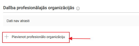 Pēc pogas nospiešanas tiks atvērta ieraksta ievades un labošanas forma, kur iespējams norādīt informāciju par profesionālo organizāciju, norādot reģistrācijas numuru. Pēc UR numura ievadīšanas nosaukums un komersanta veids aizpildīsies automātiski. Ārvalstu organizācijas gadījumā jāizvēlas attiecīgā valsts. Tālāk jānorāda reģistrācijas numurs un nosaukums. Komersanta veids jānorāda manuāli, ja sistēmā šādu organizāciju neatrada.