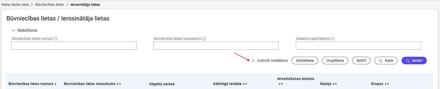 Ir formas, kur papildus kritērijus var norādīt, izvēloties izvērstās meklēšanas sadaļu. Ātrā meklēšana piedāvā ievadīt biežāk izmantotos atlases kritērijus, un izvērstajā meklēšanā atveras vēl citi ievadāmie atlases kritēriji, lai būtu iespēja atlasīt nepieciešamāko. Izvērstās meklēšanas opcija pārvietota uz pogu joslu kā saite un izskatās šādi: