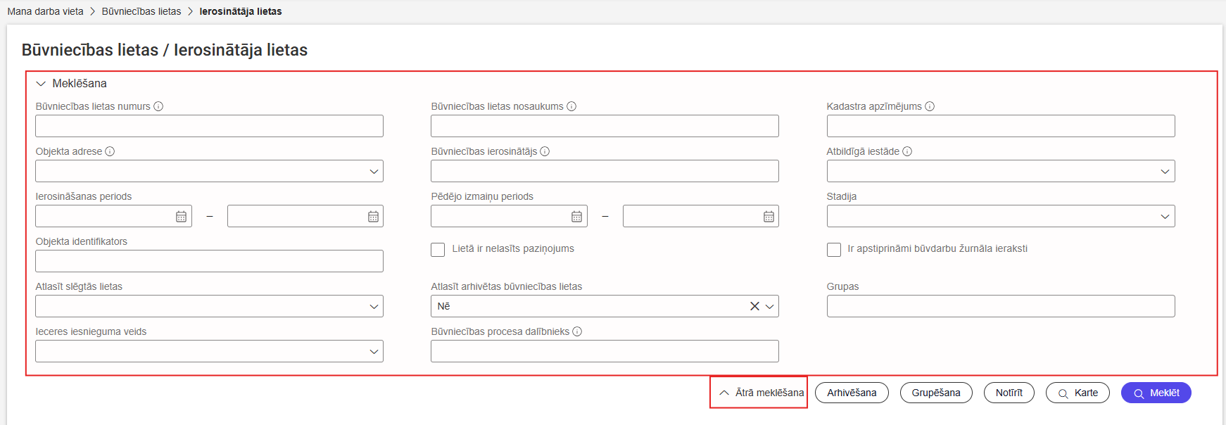 Lietotājs var norādīt meklēšanas kritērijus no ātrās meklēšanas sadaļas. Ir formas, kur papildus kritērijus var norādīt, izvēloties izvērstās meklēšanas sadaļu.