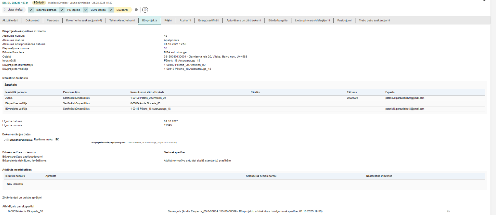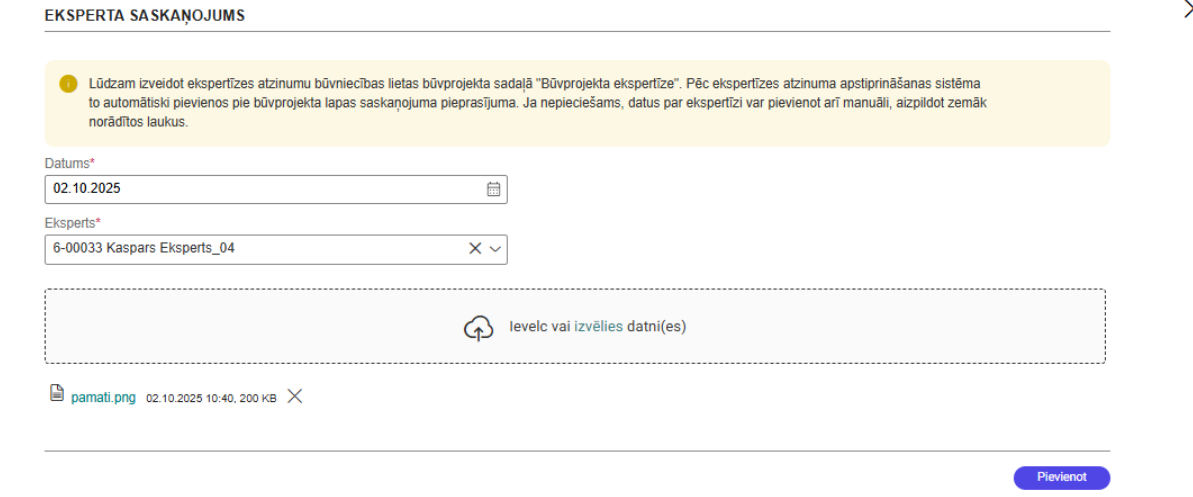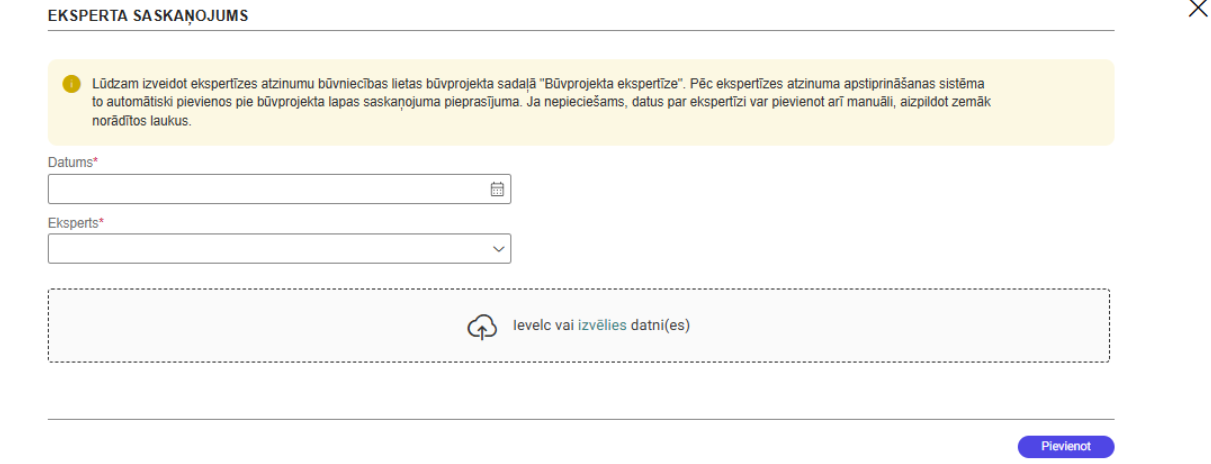 Pēc ekspertīzes atzinuma apstiprināšanas sistēma to automātiski pievienos pie būvprojekta lapas saskaņojuma pieprasījuma. Ja nepieciešams, datus par ekspertīzi var pievienot arī manuāli, aizpildot zemāk norādītos laukus".