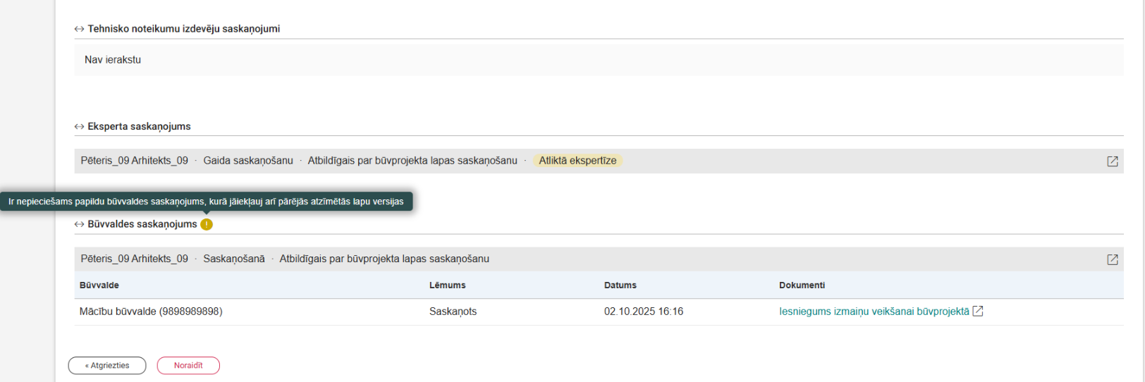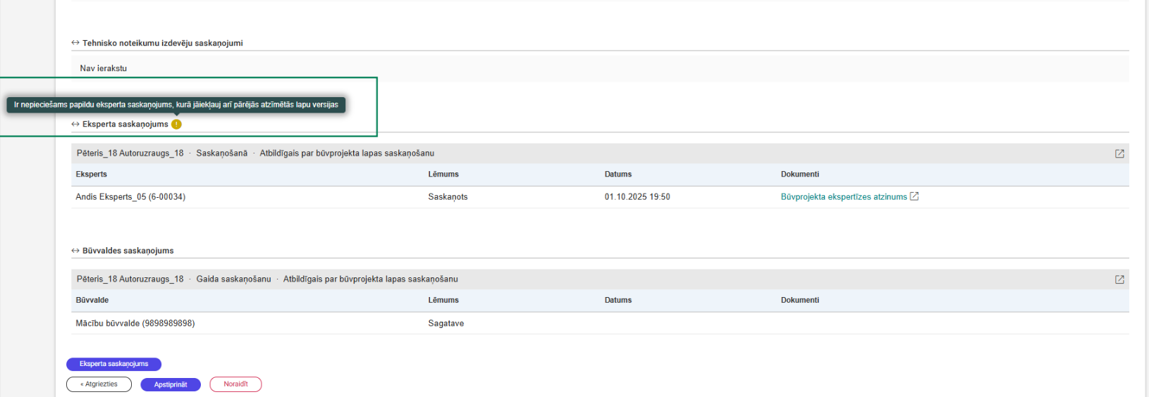 - Ja konkrētajai lapas versijai ar pamatojumu ‘Atbilstoši Vispārīgo būvnoteikumu 69. punktam’ vēl nav apstiprināts būvprojekta ekspertīzes atzinums, tad tas netiks rādīts sadaļā ‘Eksperta saskaņojums’, bet lietotājs var redzēt informatīvu paziņojumu, ka ‘Ir nepieciešams vēl eksperta saskaņojums, kurā būs iekļautas arī pārējās atzīmētās lapu versijas’.