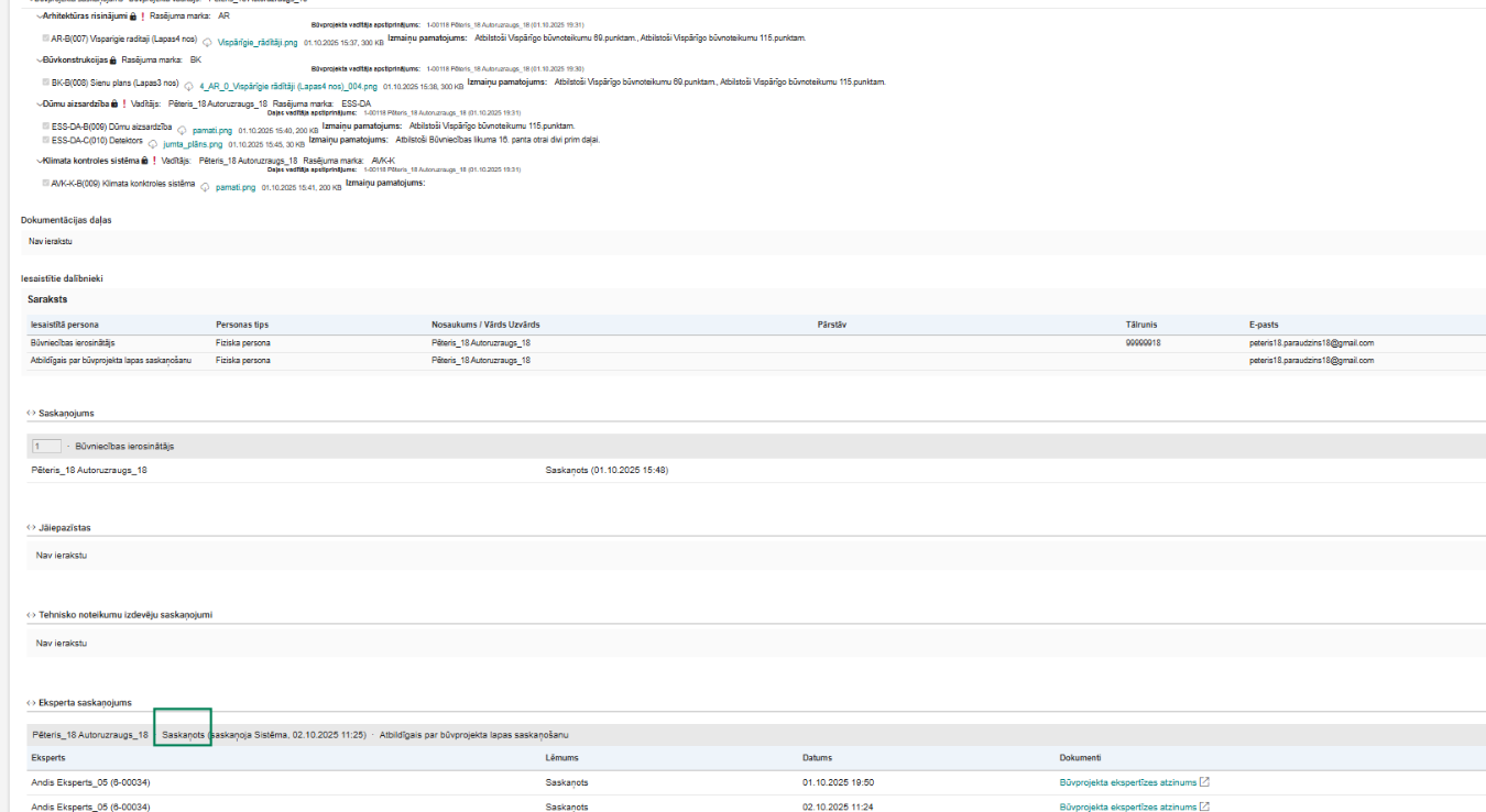 - Ja būvprojekta lapas saskaņojuma pieprasījumam, sadaļā ‘Eksperta saskaņojums’ ir pievienots būvprojekta ekspertīzes atzinuma dokuments, tad sistēma pie tā uzliek ‘Saskaņots’, kā saskaņojuma apstiprināšanas datumu un laiku pie atbilstošā dokumenta.