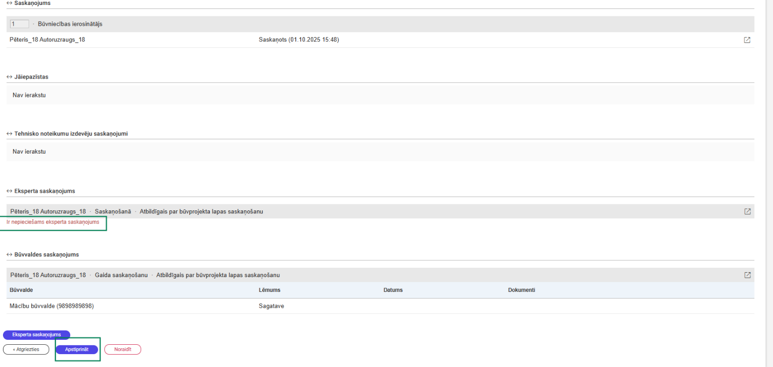 Ja lietotājs šajā būvprojekta lapas saskaņojuma pieprasījumā ir norādīts kā atbildīgais par eksperta saskaņojumu pieprasīšanu, atverot šo būvprojekta lapas saskaņojuma pieprasījumu, ja tajā ir viena vai vairākas lapas ar pamatojumu ‘Atbilstoši Vispārīgo būvnoteikumu 69. punktam’ un katrai varbūt atšķirīgs ekspertīzes atzinums: