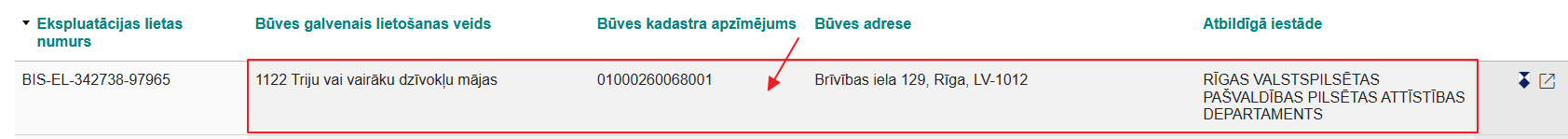 Ekspluatāciju lietu sarakstā (sk. Ekspluatācijas lietu saraksts) lietotājs atver sev pieejamo Ekspluatācijas lietu, izdarot peles klikšķi uz ieraksta rindas: