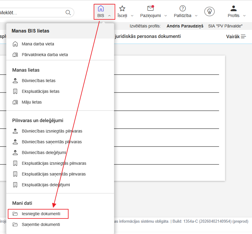 Attēls. Atvērt iesniegto dokumentu sarakstu no sadaļas "Mans profils".