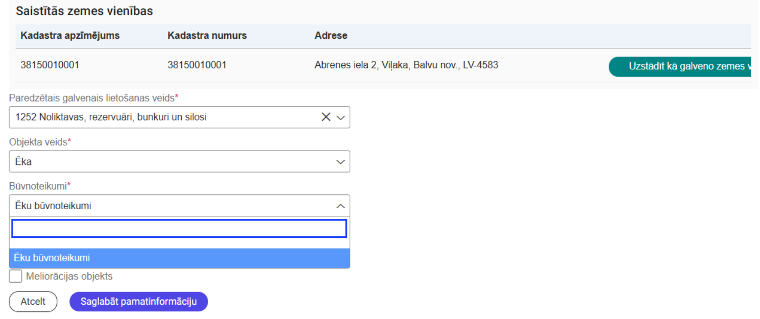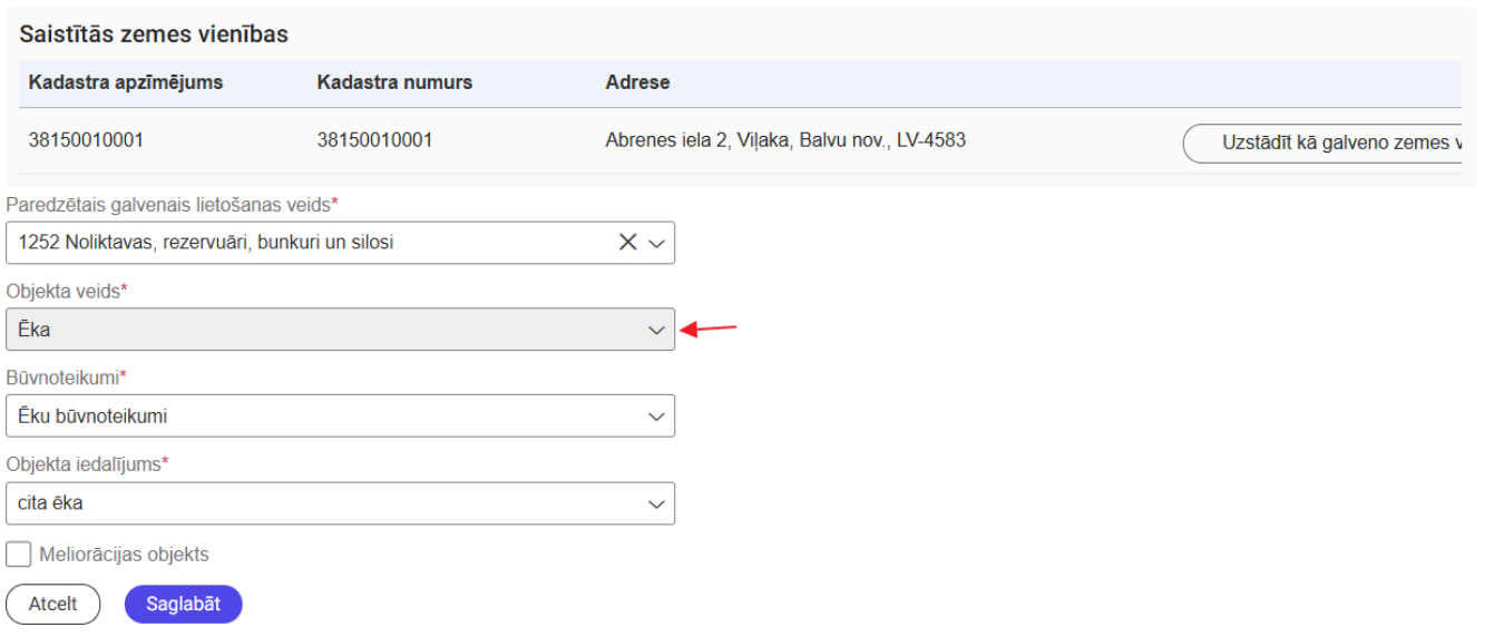 Ja lietotājs ir norādījis paredzēto galveno lietošanas veidu 1252 (vai tas tika automātiski ielasīts no kadastra datiem), lietotājs var izvēlēties objekta veidu: